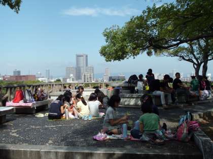 大阪城の近くで昼食をしました。とても眺めの良いところで,大阪の町を見ながらおいしいお弁当をいただきました。天気も良くて本当に良かったです!