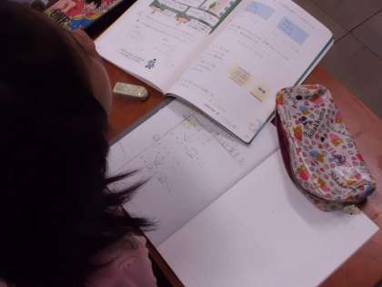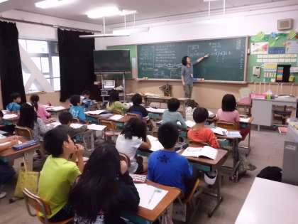 木や学校の高さを求めるために,何倍になっているか考えて計算しました。問題を解く時に式が2つ以上ある場合,何とか1つにできないかみんなで話し合いました。友達の意見を聞きながら,自分のノートを見ている子もいました。
