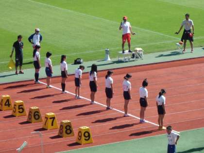 晴天の中,広く大きな陸上競技場で緊張しながらも,自分の力を出しきりました。