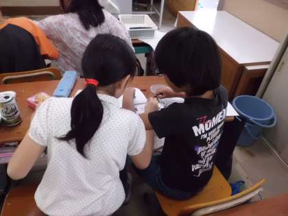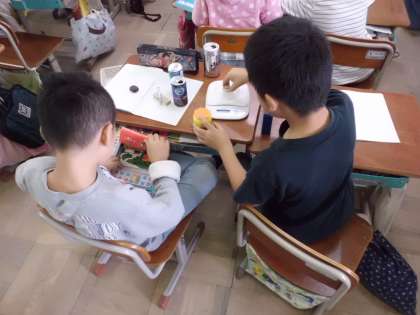 理科の時間に電子はかりを使って,空き缶や積木などいろいろなものの重さをはかりました。最後に身の回りから5gのものを見つけました。隣の人と相談しながら何度も試していました。