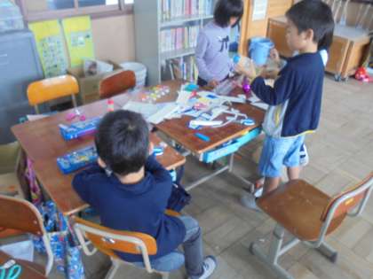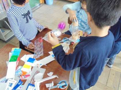 生活科「あそんで ためして くふうして」で,身の回りにある材料を使っていろいろな活動を行っています。
