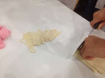 午前中は,中野うどん学校でうどん打ち体験です。職人さんに教えてもらいながら,うどんの生地を練ったり伸ばしたり。最後に,包丁でほどよい長さに切って完成です。