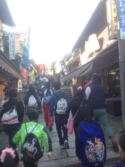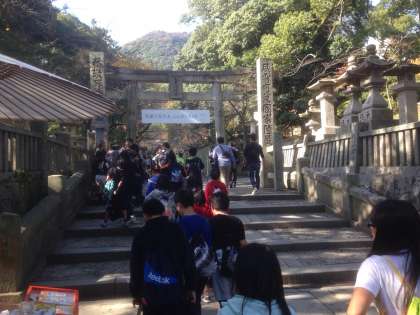 楽しいうどん打ち体験が終わると,グループごとに写真を撮るために金刀比羅宮に登ります。撮影ポイントの大門までの階段は365段ありましたが,子どもたちは、元気に登っていました。