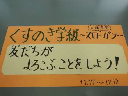 クラスで人権スローガンを決めました。子どもたちが意見を出し合い,決定したスローガンは「友だちがよろこぶことをしよう」です。