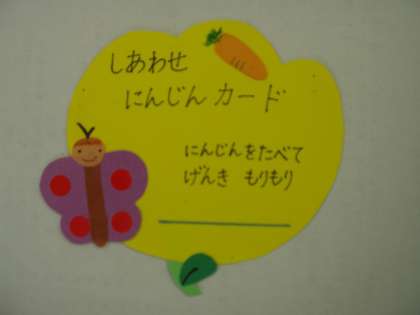 幸せにんじんを探してくれたお友達を,次の日に全校のみんなに写真で紹介しています。その月をイメージしたカードももらえます。