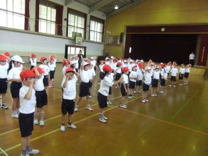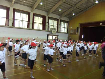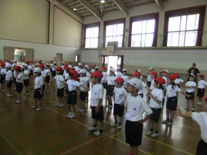 写真は,団体競技の入場の時のダンスの練習です。曲は,ドラエもんの映画の主題歌miwaの「360°」です。のりの良い曲なので,みんなすぐ覚えて,楽しく踊っています。運動会のダンスをお楽しみに。