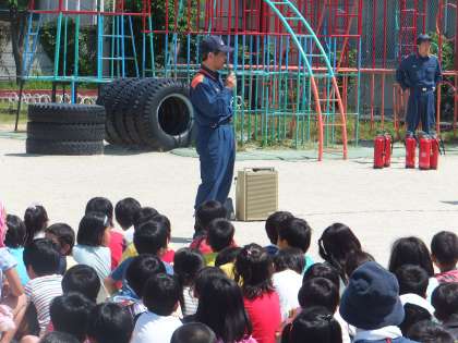 消防署の署員さんからも,いざという時にどういう行動をとれるかということと,避難の際には走らない,しゃべらないということが特に大切だというお話をしていただきました。また,教員による消火訓練も行いました。