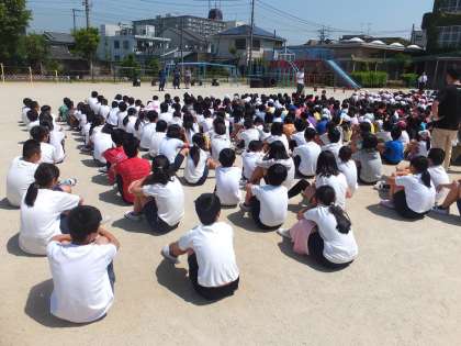「おはしもて〜おさない・はしらない・しゃべらない・もどらない(もたない)・ていがくねんゆうせん〜」という約束をしっかり守り,ハンカチで口を押さえたり,低い姿勢で避難したり,真剣な態度で訓練をしている子どもが多かったです。
