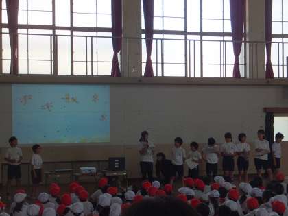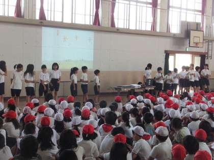 6月1日(月)朝会を行いました。環境委員会と図書委員からの発表でした。