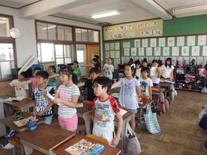 楽しい歌詞やメロディに子どもたちはすっかり虜になりました。遠くまで声をとばすイメージをもつために,片手をのばして,その指先に向かって歌いました。また,2つのパートに分かれて,お互いのパートの掛け合いも楽しみました。
