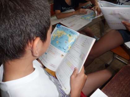教科書に書かれた世界の国の人口を読んでびっくりする子どもたち。十億の位も学び,世界の人口も「70億8007万2000人」と上手に読めました。