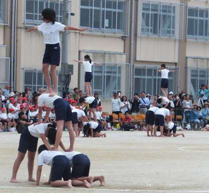 6年生の組体操。5人技,人間起こし,7段ピラミッドです。