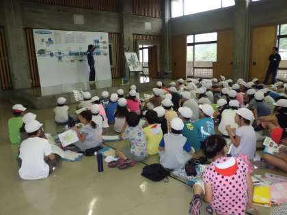 「浄水場ではどのようにして水をきれいにしているのだろう」という学習問題の解決が目標。浄水場に着くと,大型パネルが展示されているホールへ。パネルを見ながら,職員さんから水をきれいにする仕組みの全体の流れの説明を聞きました。