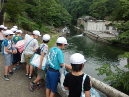 ここでは,琵琶湖から流れてくる水を見ることができます。「結構にごっているな」「魚が泳いでいる」「この水がきれいになるなんて」など,いろいろな感想が聞かれました。