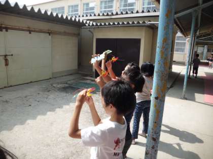 光電池にモーターをつないで,太陽に向ける子どもたち。「回った回った」と大興奮。中には光の量をうまく調節して,モーターの回るスピードをコントロールする子も。光電池の仕組みだけでなく,便利さや面白さにも気づくことができました。