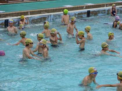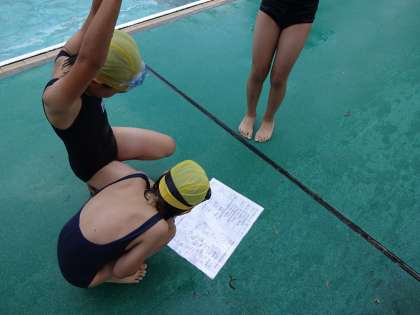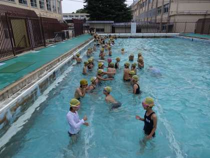 前回の学習予定日は延期になっていた分,子どもたちの喜びもひとしお。水慣れの場面では「気持ちいい!」という声があちこちから聞かれました。学習がスタートし,水遊びにチャレンジしたり,クロールにチャレンジしたりする場面では,プールサイドに置かれた学習カードを見て,自分の取り組む活動を見つけ,意欲的に学習する姿が見られました。