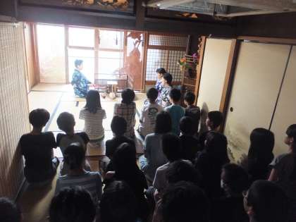まずはお手前の見学です。1つ1つの作法はもちろん,床の間の飾りや使っている道具にもおもてなしの心配りがあふれていることを教えていただきました。