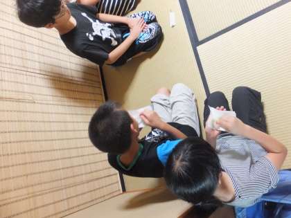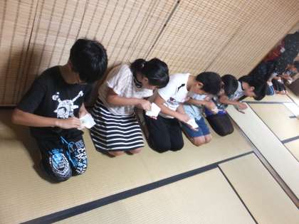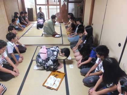 お菓子を配っていただく際には先ほど練習した礼を行い,感謝の気持ちを表します。おいしくいただきました。