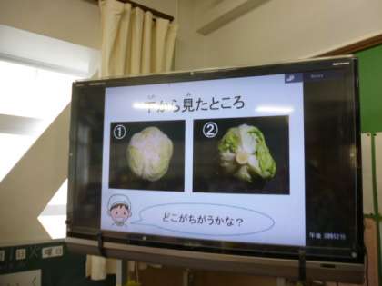 半分に切られた野菜の写真を見ながら子どもたちは考えていました。