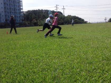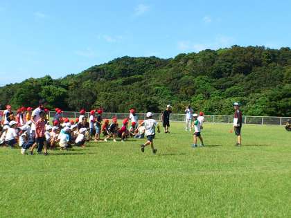 祥豊小学校の4年生との交流活動は,クラスごとのリレー対決です。
