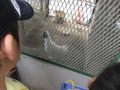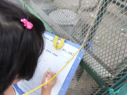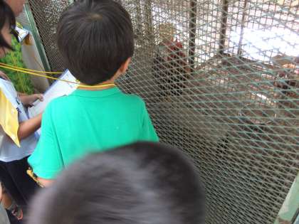 生活科の学習で,学校にいる生き物を調べました。東の森で飼育しているニワトリとウサギです。網越しに見るので,見えそうで見えないような・・・ニワトリは,白色と茶色が3羽いました。「いたー!」とみんな大喜び。みんなが集まって見ているせいか,興奮して元気よく「コケコッコー!」と何回も鳴いてくれました。ウサギは,お昼寝中なのか,あまり動きませんでした。間近に見ることができてうれしそうな1年生でした。