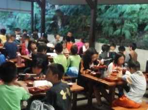 たくさん食べて、キャンプファイヤーに備えます。
