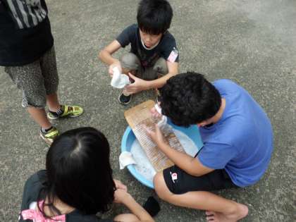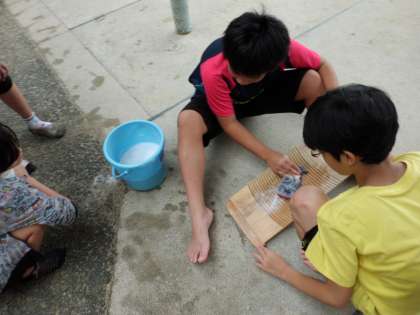 洗濯機がなかった頃は,洗濯板とたらいを使って手洗いをしていました。