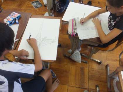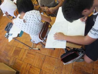 3組は若田光一さんが宇宙飛行士としてどのような思いで活躍したかを描いた「宇宙への夢 力いっぱい!」に取り組んでいます。宇宙での人類の活躍に想像を膨らませながら描いています。