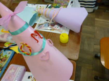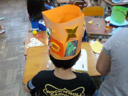 お家で用意をしてもらった材料と学校での材料を使ってぼうしを作りました。