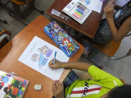 男の子と女の子の服の色を塗って,みんなでどんな色を塗ったのか話し合いました。男の子は青(水)色,女の子は赤(ピンク)色を塗った子どもが半数弱いました。他は男女関係なく,オレンジや緑,黄色,紫色を塗っていました。みんなが好きな色を塗ったように,男女で色が決まっているわけではないことを確認しました。教室のみんなが着ている服もいろいろで,男の子も赤をカッコよく着ていました。水色が好きな女の子もいました。