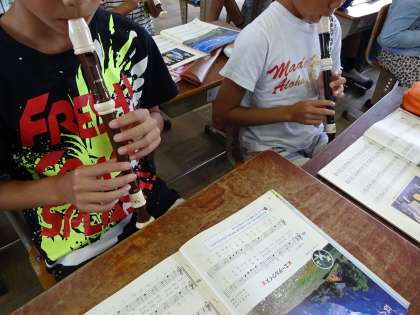 夏休みの宿題の中の一つ,リコーダーで「エーデルワイス」を吹いています。