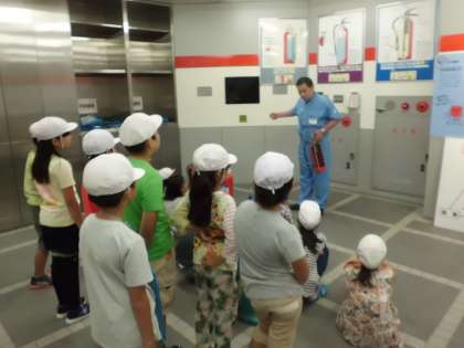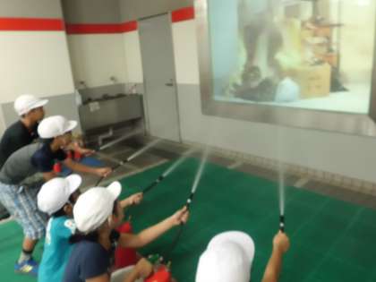 火事を発見したときに消火器を使って素早く消火する体験をしました。