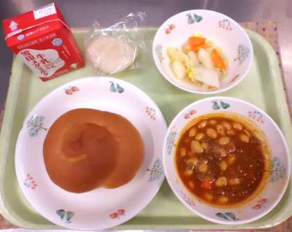 チリコンカーンは,牛ひき肉・たまねぎ・にんじんと一緒に大豆をコトコト煮込みました。カレー味がアクセントになっています。デザートの梨は,二十世紀なしです。とてもみずみずしく,大好評でした。ひと足早い実りの秋の訪れです。