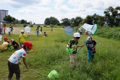 桂川の河川敷で,たくさん飛んでいるトンボやバッタたちに,子どもたちはわくわくしていました。