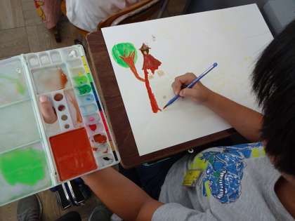 図工の学習でお話の絵を描いています。