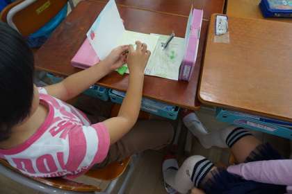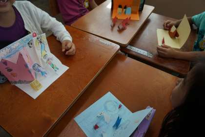 図工の「おって たてたら」の学習で作った作品をみんなで交流しました。