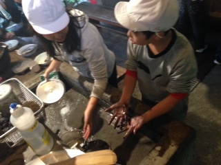最後に,しっかり食器など洗えているか確認をします。綺麗になってるか,チェック中。合格すると,みんなで喜んでいました。