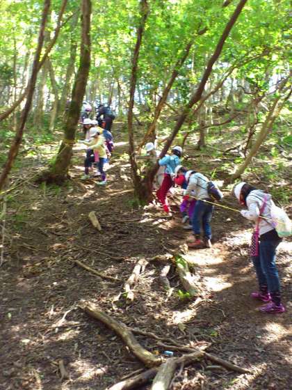 急な下り坂は、ロープを持ちながら、少しずつ進みます。
