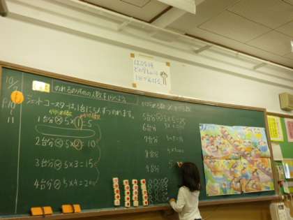 かける数が1つ増えると答えが5ずつ増えることをブロックや図で確かめました。