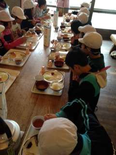 朝の集いの後,朝食です。パンを選ぶ子が多いです。