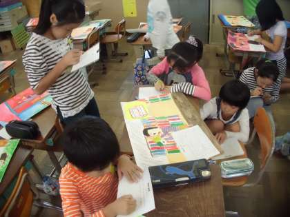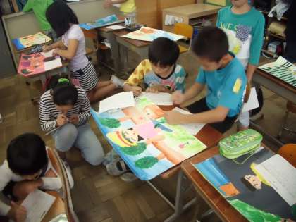 図画工作科では「物語の世界」という題材で,お話を聞いて想像したことを描く活動に取り組みました。