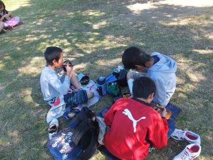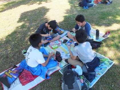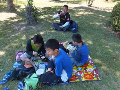 大阪城公園でお弁当を食べました。たくさん歩いて少し疲れた子どもたち。