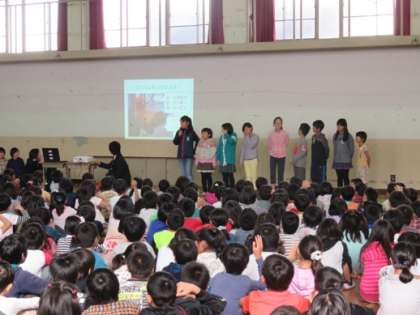 学校で飼っている烏骨鳥やウサギのことをクイズにして,全校児童に向けて問題を出してくれました。3択クイズなどがあり,楽しい朝会でした。