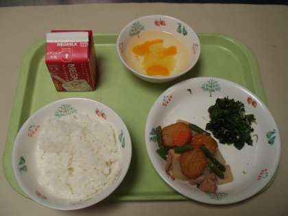 「フルーツ寒天」は,給食室で,寒天と砂糖とフルーツを煮つめて,作ります。温かい状態のまま,クラスで配食し,しばらくすると食器の中で固まってゼリーになります。