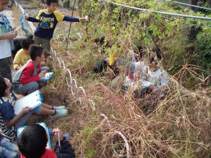 春に植えたツルレイシがどのようになっているのか,夏の終わりの観察カードとくらべながら観察を進めました。「葉が茶色になっている」「花はまだ少しある」「実があるけど,夏の頃より小さいな」と,たくさんの気づきを観察カードに記録していきました。