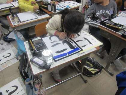3年生は習字で初めてのひらがな「にじ」という文字を書きました。