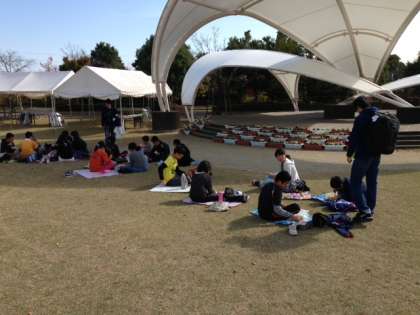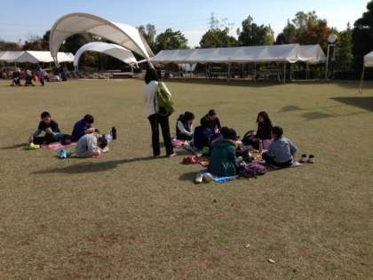 広い芝生でいいお天気中のんびりとお昼ご飯を食べています。