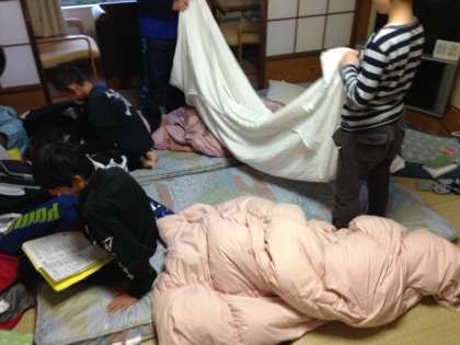 起床した子どもたちは、協力して寝具の片付けをしたり、荷物の整理をしたりしました。
