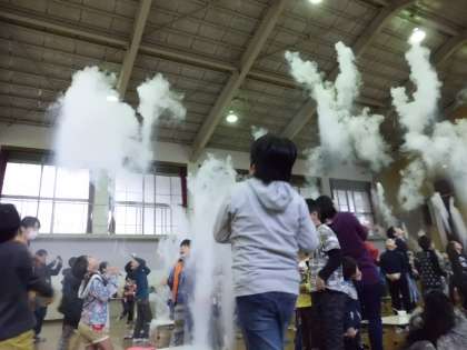 14日(土)の午前中に本校体育館で「科学教室」がありました。今回の内容は,ドライアイスで遊ぼうです。各グループにドライアイスを配ってもらい,人工の雲を作りました。