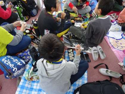 お昼は,祥豊小学校と友だちとお弁当を一緒に食べました。各ブースのメンバーと集まり楽しく食べることができました。
